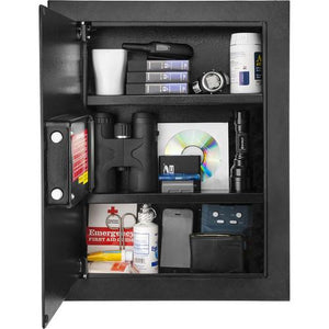 The Barska AX13034 is engineered to fit securely between standard 16 o/c studs in a 4" deep wall, making it ideal for home or office installation. With exterior dimensions of 20.75" H x 15.40" W x 3.73" D, an interior capacity of 0.52 cu. ft., and a weight of 28.8 lbs, this biometric wall safe offers reliable security in a compact footprint.