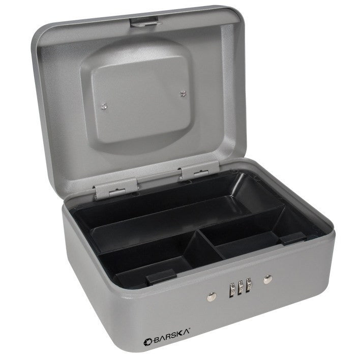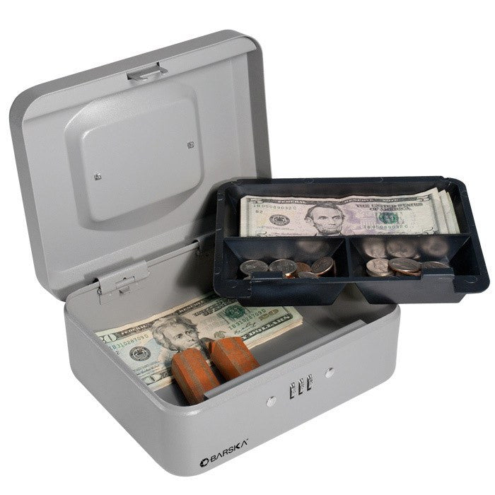 This line of Cash Boxes with Combination Locks offers versatile storage for cash, coins, checks, receipts, and other items, making it perfect for home and business use. The removable tray provides convenient coin counting with a quick lift and angled design. Additional space below the tray allows for flexible storage of cash and valuables. Plus, it features a recessed fold down carrying handle for easy portability and storage.