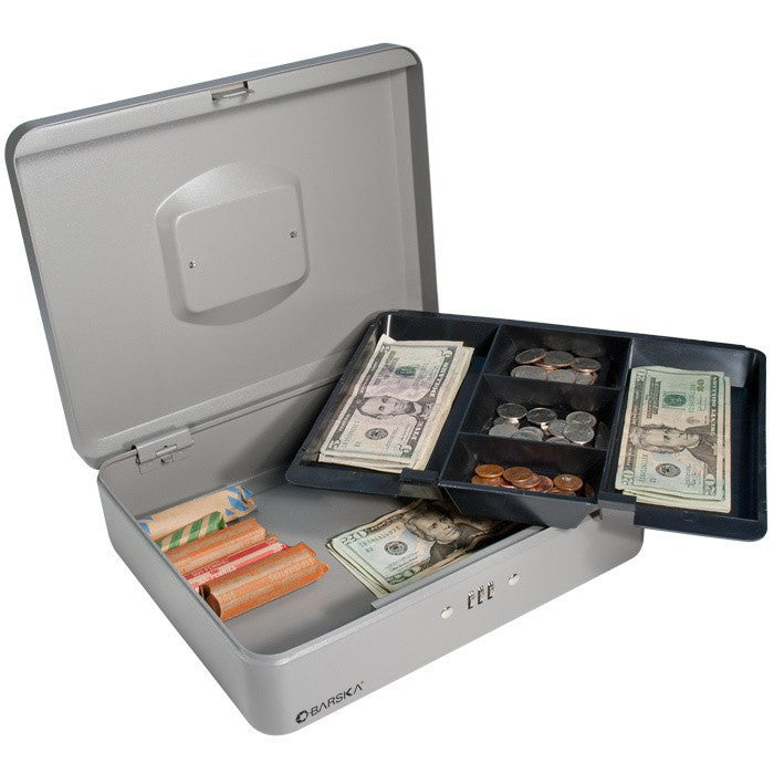 The Barska CB11788 12" Cash Box with Combination is a versatile storage solution for keeping cash, coins, checks, receipts, and other valuables safe. Its removable tray features an angled design for easy access and precise coin counting, while the spacious compartment below offers flexible storage options. The box also includes a recessed fold-down handle for portability and convenient storage.