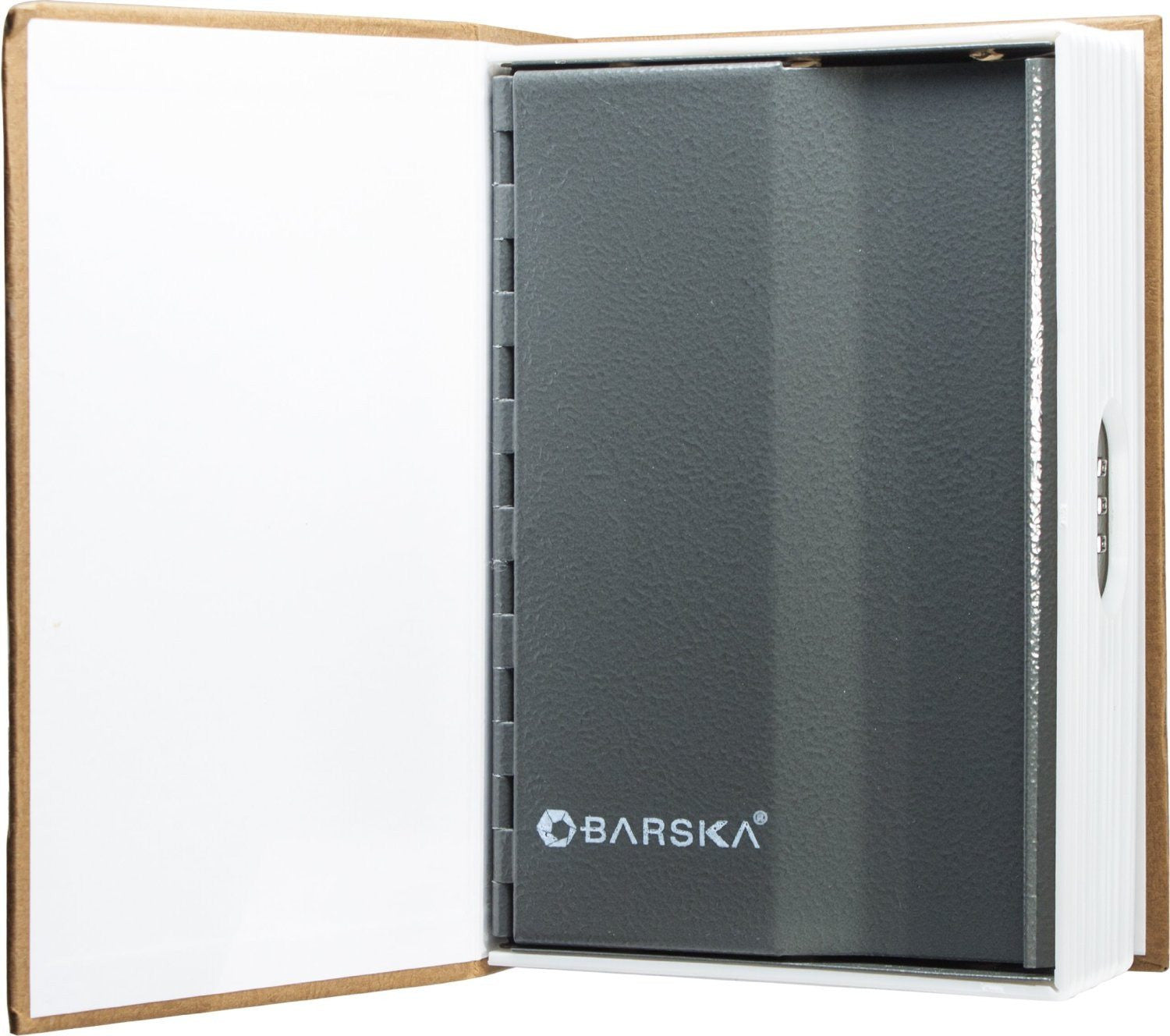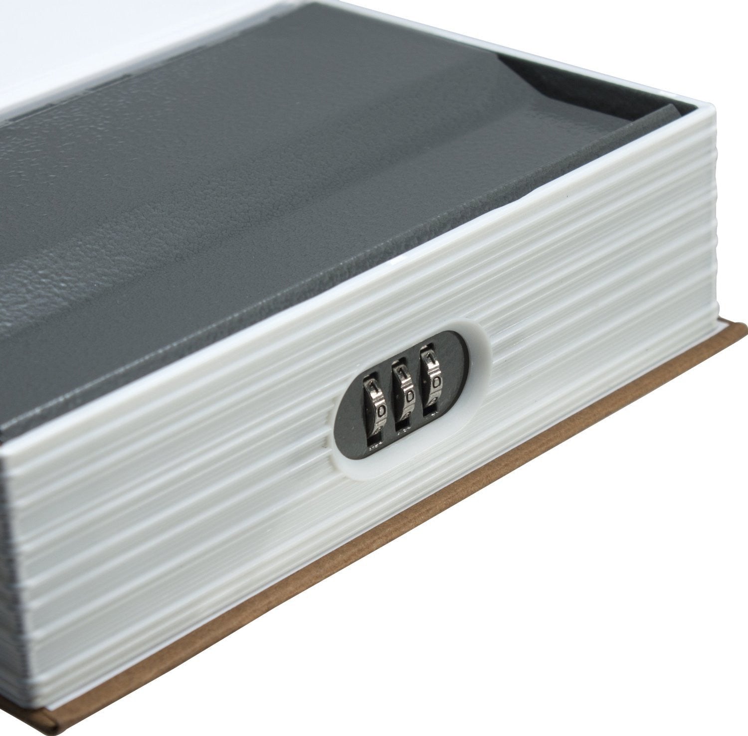 This compact lock box is disguised to appear like a hard back book, but when the front cover panel is opened it reveals a customizable combination lock with a strong compact steel lock box. The form factor is an easily portable design that can be stored and hidden in plain sight for safekeeping. Ideal for safely hiding valuables, storing money, passports, jewelry, and other small items.