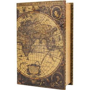 The Barska CB12480 Antique Map Book Lock Box appears as a genuine antique book with a hidden compartment for safeguarding valuables. The steel door of the compartment is accessed through one of two keys included with the lock box. A magnetic closure on the front cover keeps the book securely shut, allowing it to blend seamlessly into any home decor. It's an ideal solution for storing money, jewelry, passports, documents, and other important items.