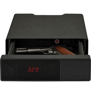 - Discreet Display Panel and Spring Assist Drawer - Tempered glass front panel elegantly contains the RFID reader, clock display, and access code keypad. The Spring-assist drawer quietly slides open to reveal a padded interior. Accommodates most full-sized handguns and/or valuables.