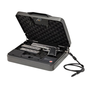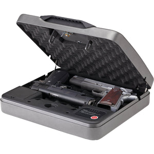 The Hornady Rapid Safe 4800KP XXL RFID 98141 allows for quick access in several ways. The RFID watchband, key fob, or sticker can be used by simply touching them to the safe's surface, activating the spring-assist lid. Up to five RFID tags can be programmed for easy entry. Alternatively, the safe can be accessed through the convenient keypad that allows for a personalized four to six digit code. For added security, the secondary entry method can be used. The barrel key override is another way to open the safe, which is crafted from durable 14 gauge steel with two internal hardened locking lugs. The safe can be powered by either batteries or an AC power source. Additionally, the safe includes a security cable to firmly attach it to a solid surface.