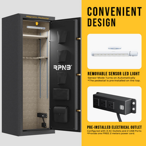 Designed for both security and functionality, the RPFS14-B also includes a factory-installed power outlet with three AC ports and two USB ports, perfect for powering a dehumidifier rod, charging devices, or running essential accessories. The soft inner lining protects firearms from scratches, while the motion-activated LED sensor light enhances visibility in low-light conditions.