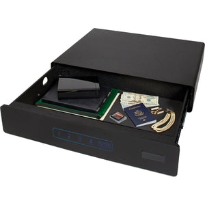 This product includes a slide-out drawer for storing firearms, jewelry, documents, and other valuables. The digital lock, with a key backup, allows for a 3 to 8 digit access code to be programmed. The door is designed to be pry-resistant, preventing access from children and unauthorized users. Made of 14-gauge heavy-duty steel, it also has pre-drilled holes for easy permanent installation. Additionally, a sturdy 5-foot cable can be used to secure the safe to a stationary object for added protection.