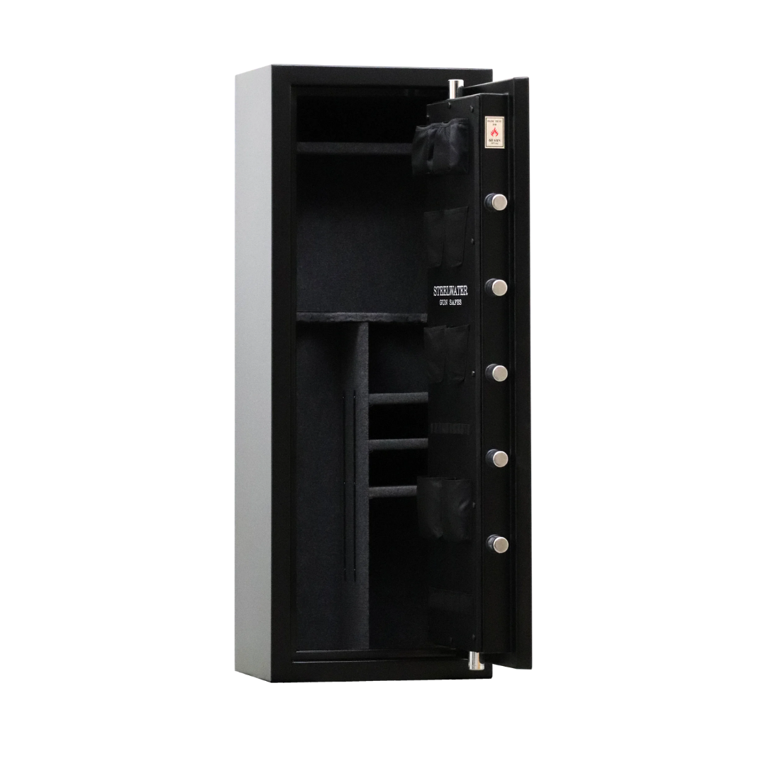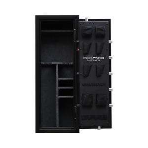 This new gun safe is packed with features for enhanced security, organization, and fire protection. It includes a Custom Door Organizer Kit and Automatic Interior LED Lighting for convenience. The safe is built with (10) 1.5'' solid steel locking bolts and a composite 4 7/8" thick door with two layers of fireboard, offering 60-minute fire protection at 1875°F. Constructed with 14-gauge steel, the door opening measures H: 53 1/4'' x W: 16 1/4'', with a depth of 34 1/2'' when opened at 90°. The interior accommodates up to 16 long guns (medium capacity: 8-10 guns), with a fully lined grey interior featuring a two-section gun rack, (4) adjustable shelves, and a free silica gel rechargeable dehumidifier.