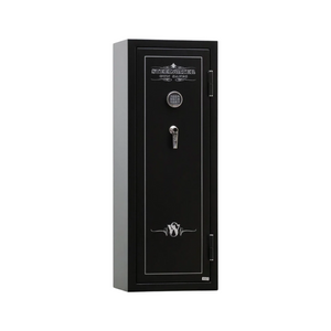 The safe includes a 3-way direct drive lock and bolt system, chrome-plated active bolts, and an anti-tamper hard plate for added security. A spring-loaded re-locking bolt ensures the safe remains locked if tampered with, and a heat-activated expandable door seal provides protection against smoke and water. The exterior features a satin-textured black powder coat, polished chrome lever handle, and pin striping for a sleek look. Pre-drilled holes allow for easy installation of a dehumidifier and floor anchoring. This high-quality safe ensures superior protection and functionality for your valuables and firearms.