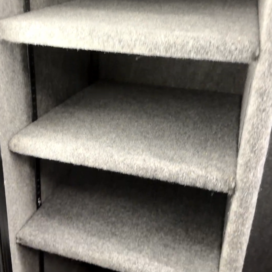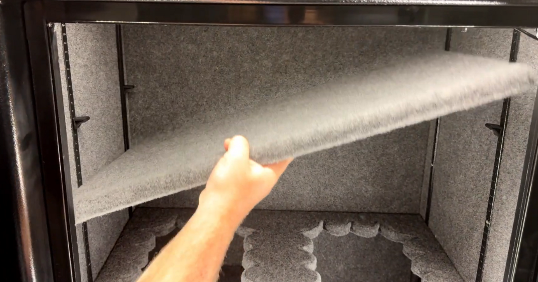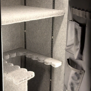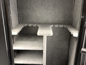 - Fully upholstered grey interior with a two-section gun rack and (4) adjustable/removable shelves