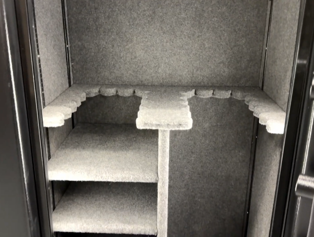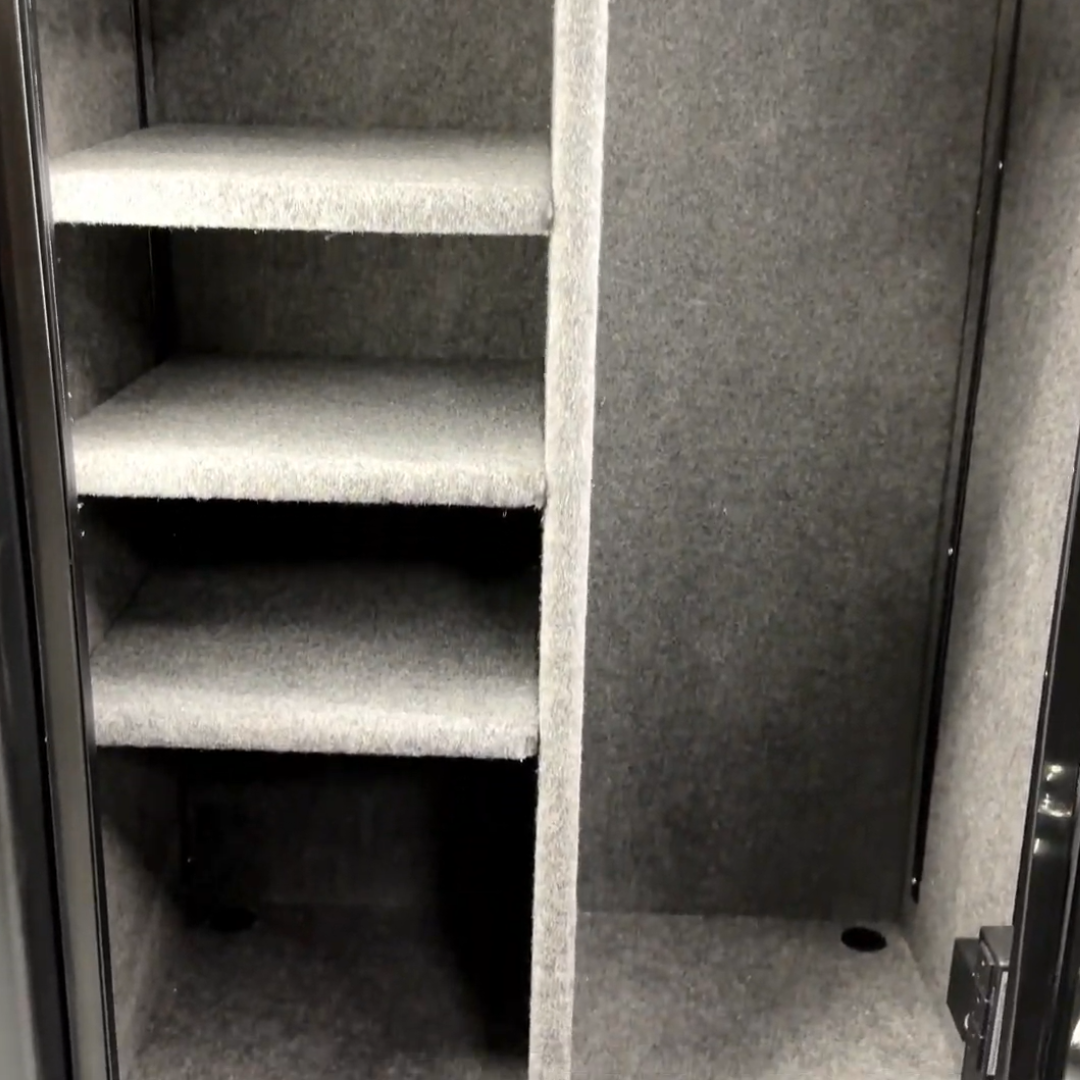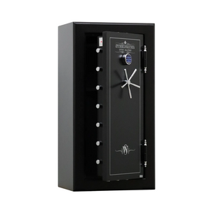 This premium gun safe offers exceptional security, fire protection, and advanced features. It includes a new EMP-proof digital keypad with a high-security, drill-resistant bypass key and an optional X3 Biometric EMP-proof lock allowing access via fingerprint, digital, or mechanical key entry for up to 200 users. Designed for convenience, it features automatic LED interior lighting for low-light access and a fully upholstered grey interior with a two-section gun rack holding up to 22 long guns (average capacity: 14-18), along with 4 adjustable/removable shelves for versatile storage.
