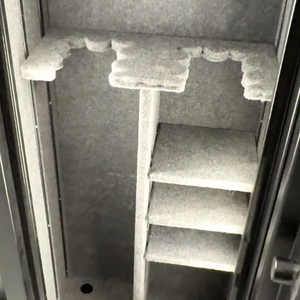 - Fully upholstered grey interior that features a two-section gun rack that can store a maximum of (8) long guns per section and includes (4) adjustable/removable shelves for additional storage options