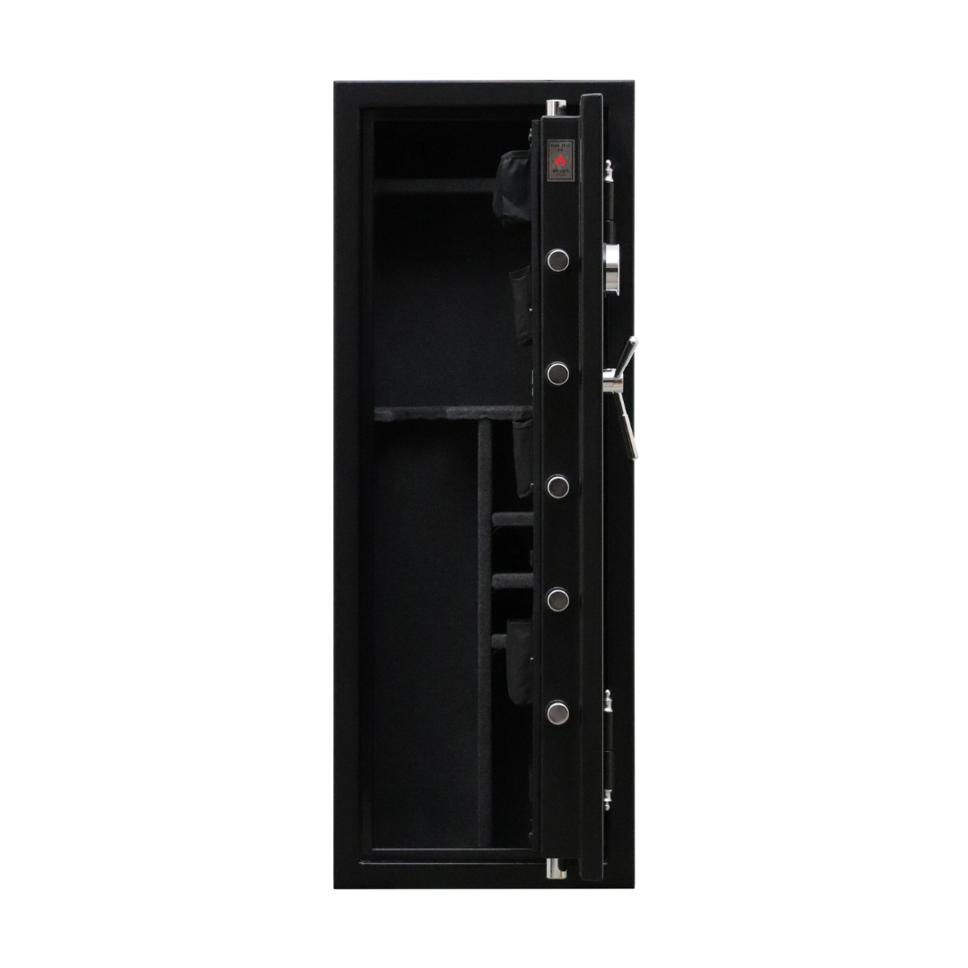 This premium gun safe combines advanced security, fire protection, and modern features. It offers 60-minute fireproofing at 1875°F, a composite 4 7/8” thick door with double fireboard layers, and a 12-gauge steel construction for durability. Security is reinforced by (10) 1.5” solid steel locking bolts, including (7) active bolts and (3) inactive bolts for full four-sided bolt coverage. The gear-driven lock system, drill-resistant hard plate, and internal spring-loaded re-locking bolt provide superior protection against prying, punching, and drilling attacks.