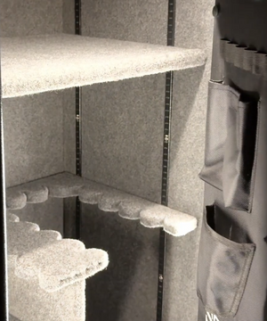 - Fully upholstered grey interior with three-section gun rack and (4) adjustable/removable shelves