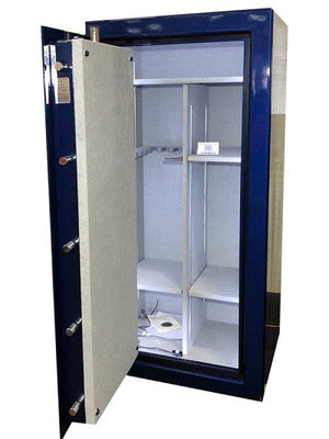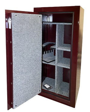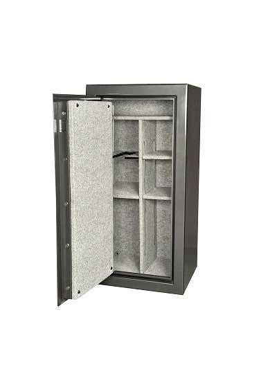 Inside, the interior is fully upholstered in gray velour and offers a fully adjustable layout, ideal for storing rifles, shotguns, handguns, and other valuables. The safe includes a 30-minute fire rating at 1200°F as standard, with optional upgrades available for 60-minute, 90-minute, or 120-minute fire protection. To ensure stability, the safe is equipped with two pre-drilled anchor holes at the base for secure mounting.
