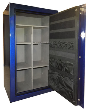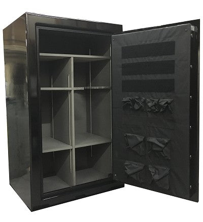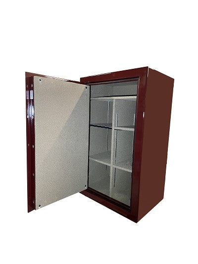 Inside, the Sun Welding P-36 Gun Safe features a fully adjustable interior wrapped in gray velour, offering a flexible and elegant space to store rifles, shotguns, handguns, documents, and other valuables. It comes standard with a 30-minute fire rating tested at 1200°F, with upgrade options for 60-minute, 90-minute, or 120-minute fire protection. To ensure maximum stability, the safe includes two pre-drilled mounting holes at the bottom for secure anchoring to the floor.