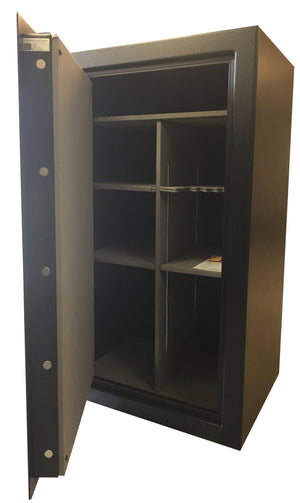 Engineered for maximum security, the P-36 Pony Express features a heavy-duty door constructed with ¼-inch solid steel. Unlike standard safes that open only 90 degrees, this model boasts reinforced hinges that allow for a full 180-degree door swing, providing easier access to your firearms. A UL-listed Sargent & Greenleaf (S&G) Group II mechanical combination lock secures the door, while electronic digital lock upgrades are also available. For enhanced protection against drilling or brute force, the door includes two re-lockers and fourteen 1-inch solid steel locking bolts, making pry attacks virtually impossible. A heat-activated Palusol door seal expands to block smoke and gases during a fire emergency.