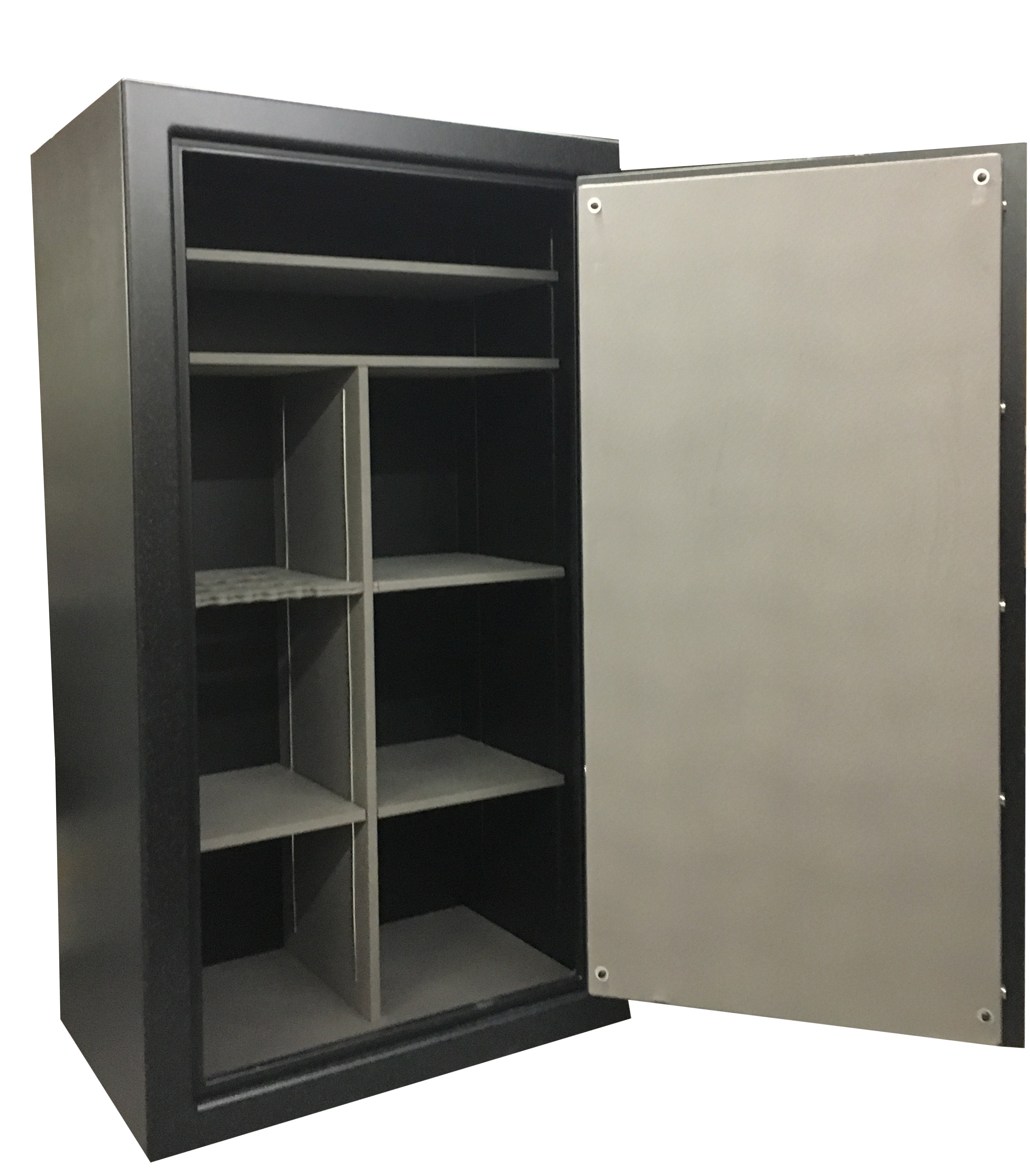 Crafted with security in mind, the P-4028T features a ¼-inch solid steel door that offers exceptional defense against break-ins. Unlike standard safes that open only 90 degrees, this model includes heavy-duty hinges that allow for a full 180-degree door swing, providing easy access to your firearms and valuables. The safe comes standard with a UL-listed Sargent & Greenleaf (S&G) Group II combination lock, with optional upgrades to a digital electronic lock. For added protection, the door is equipped with two internal relockers that activate during forced entry attempts and a heat-activated Palusol door seal that expands to block smoke and gases during a fire. To prevent pry attacks, the safe includes fourteen 1-inch solid steel locking bolts strategically positioned around the door.