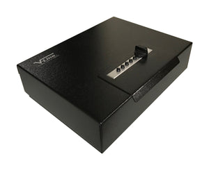 This pistol case, the V-Line Top Draw XL, has a top opening and utilizes the original SIMPLEX mechanical lock which can be programmed with five buttons. This eliminates the need for batteries. The case also has a handle on the lid for easy access. It can hold up to two pistols and has a textured semi-gloss black powder coating and brushed silver stainless lock faceplate. The interior contains heavy foam to protect firearms and valuables. The base has four predrilled holes and can be mounted securely on most surfaces with bolts.