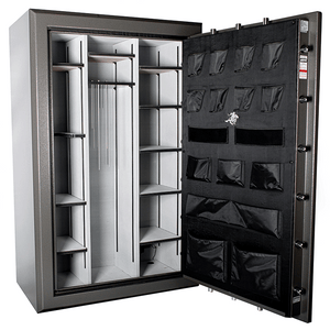 Additional features make this safe both user-friendly and premium in design. The Power Docking System includes two 110V power outlets and two USB ports for accessories like dehumidifiers or interior lighting. Inside, a motion-activated white LED lighting system ensures easy visibility, while the Deluxe Door Panel Organizer offers quick-access handgun pockets, zippered compartments, and document storage. A 5-spoke fluted chrome handle adds both style and ease of use, and the safe comes in your choice of a sleek powder-coated black or slate finish.
