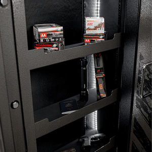 - Includes metal shelving with rubberized trays that can be used on either side to store ammunition, handguns, and gear or removed completely to store longer rifles